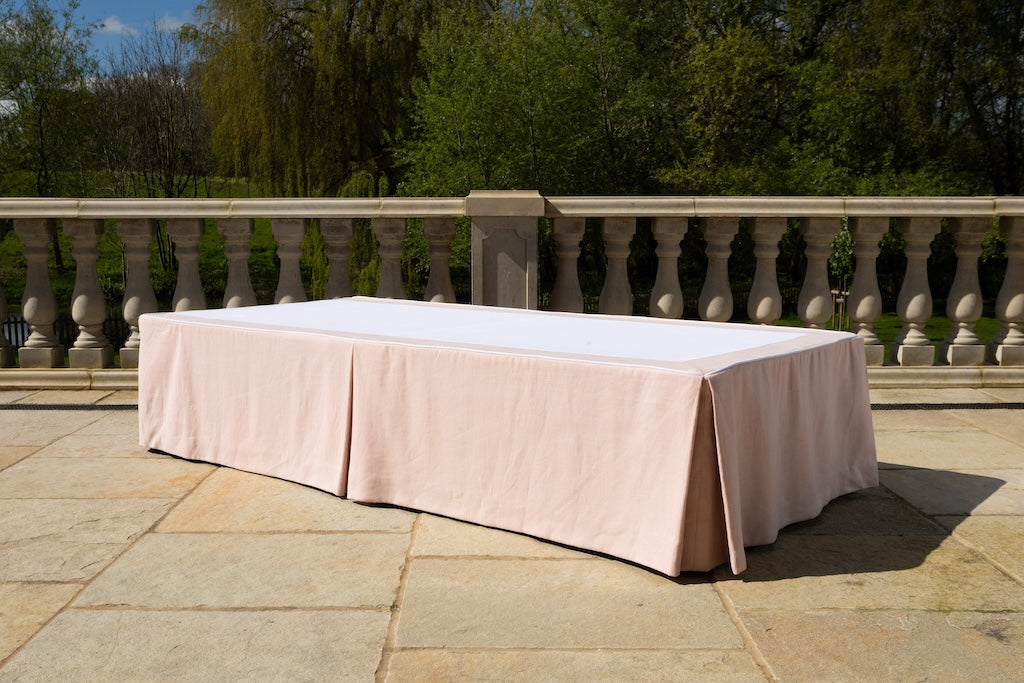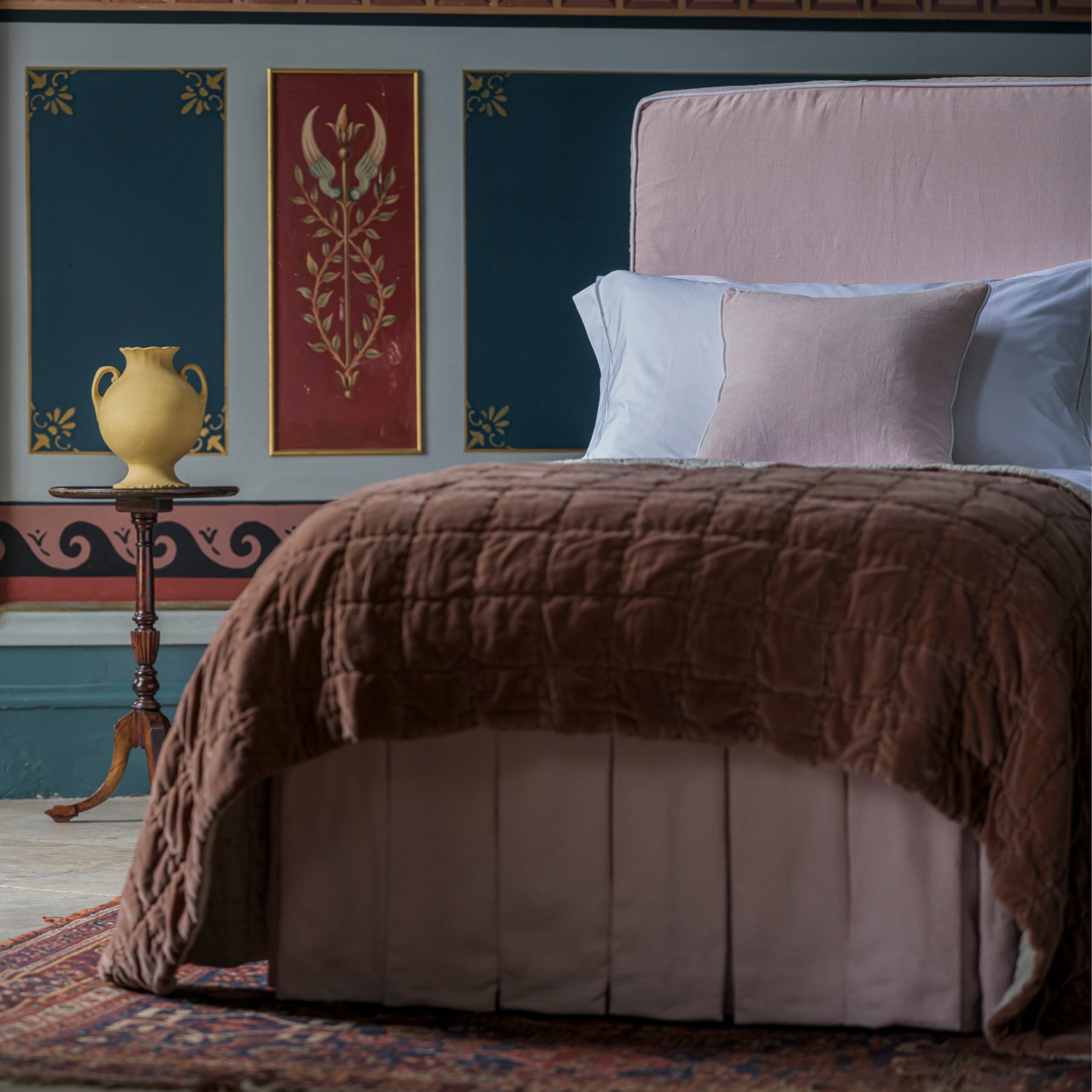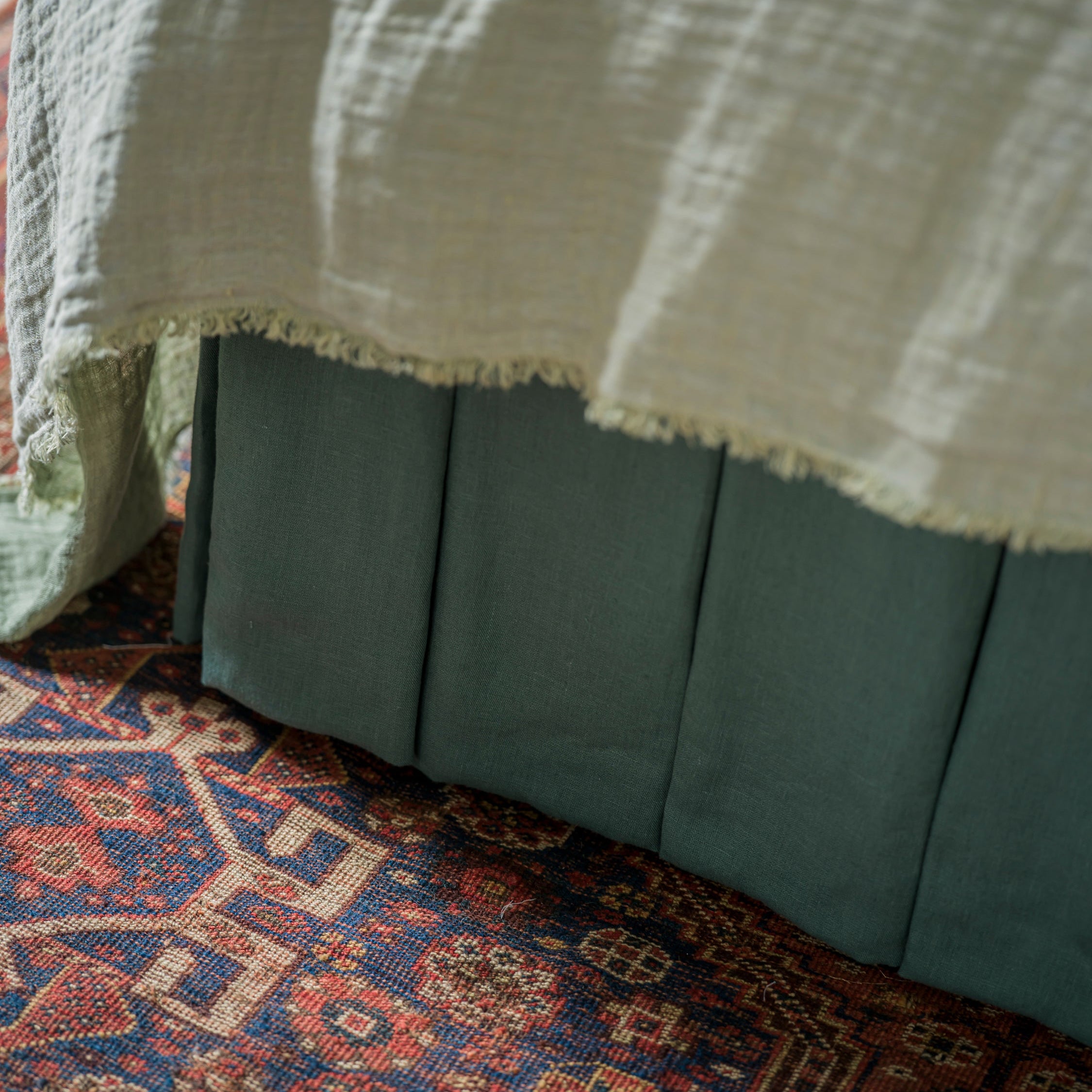 A bed valance designed with proportion and restraint in mind. It features a straight drop, inverted pleats, contrast piping and a heavy linen.